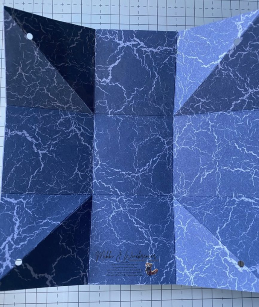 • Fold all scored lines as you see above and punch holes in the 4 corners for your ribbon