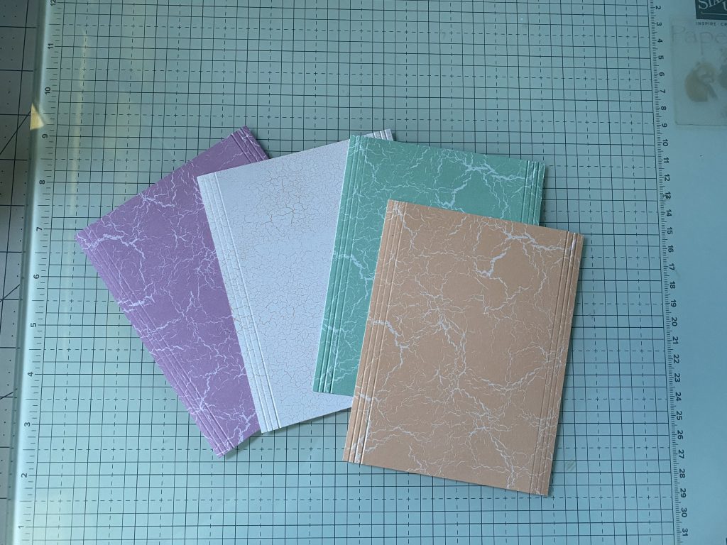 • Cut 4 pieces of the Shades and Hues DSP and 4 of the Shy Shamrock cardstock.