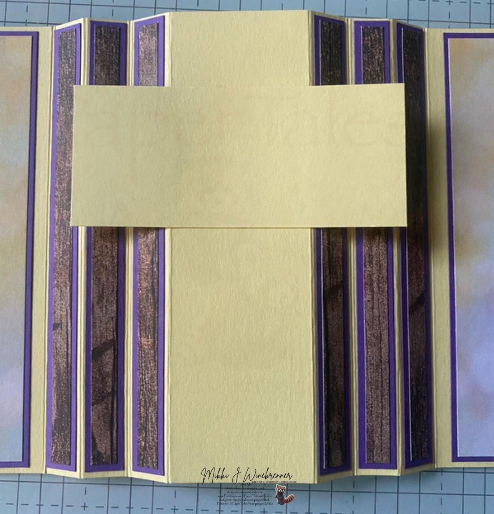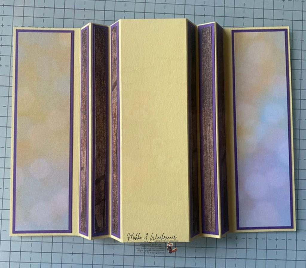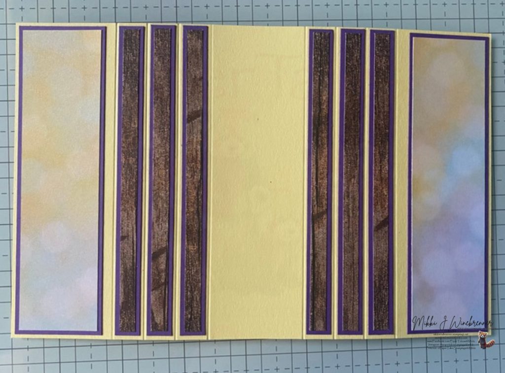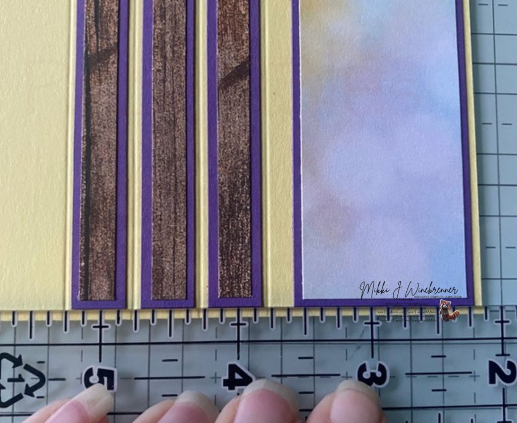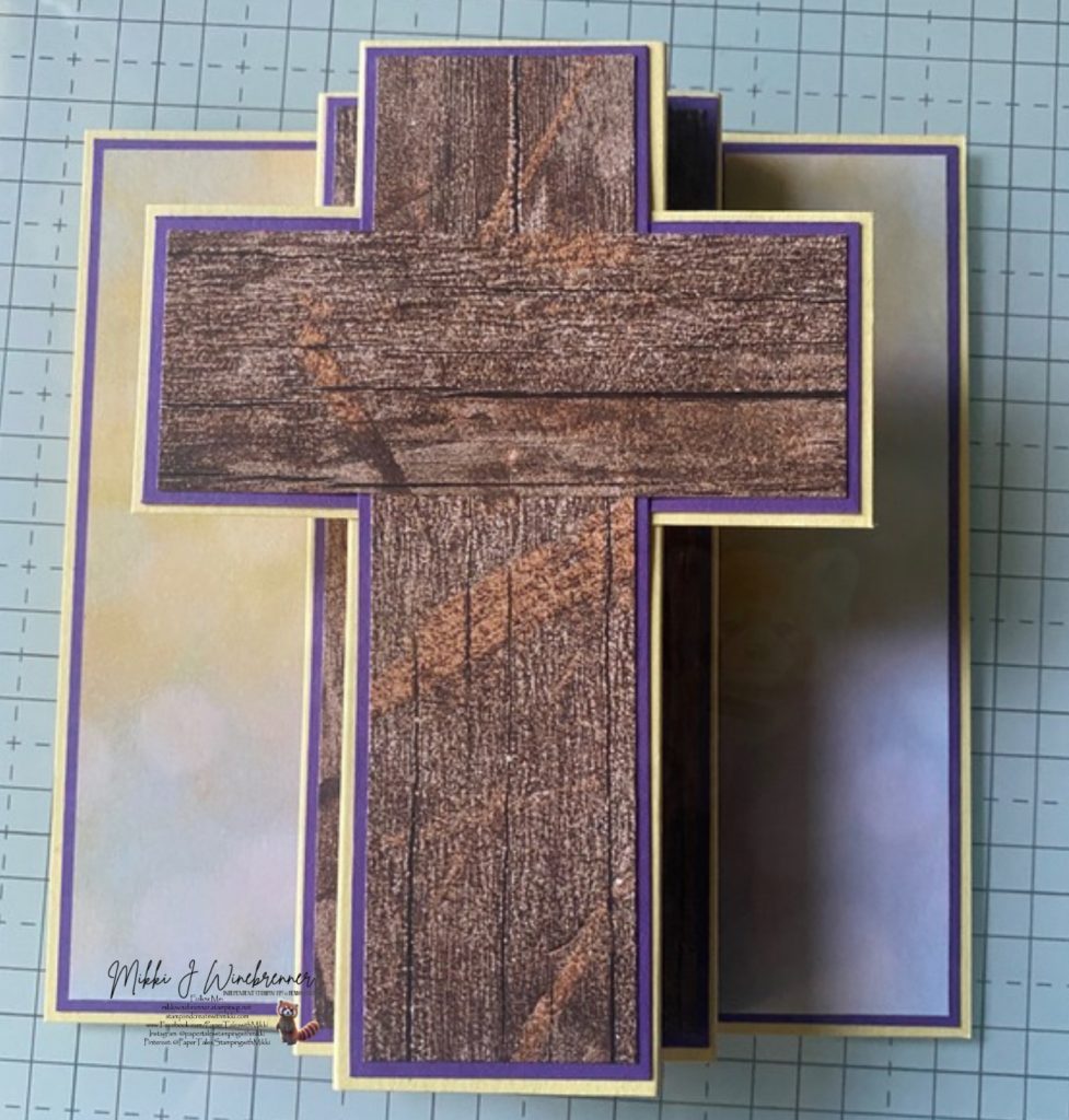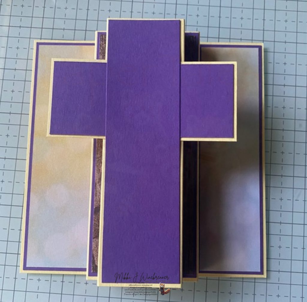 - Attach the 2 small Gorgeous Grape panels over the Lemon Lolly and the Country Woods DSP over that. With this section you really have to build it in layers to get a smooth cross.