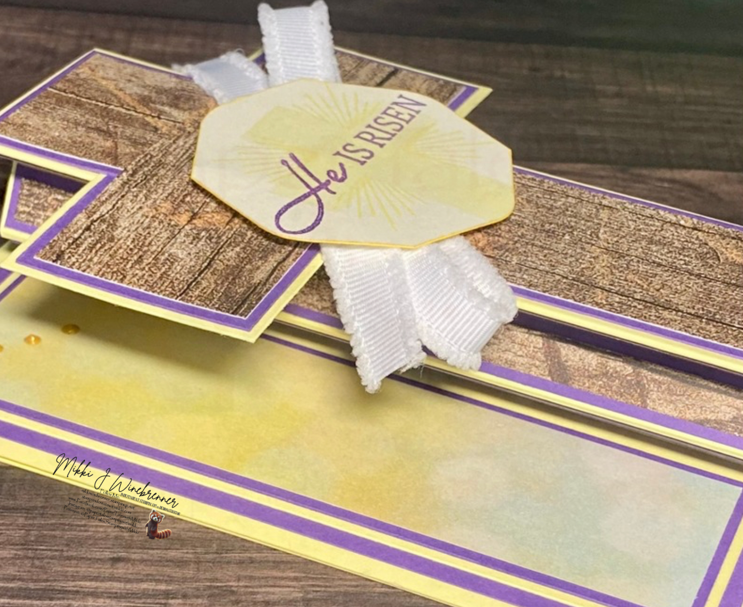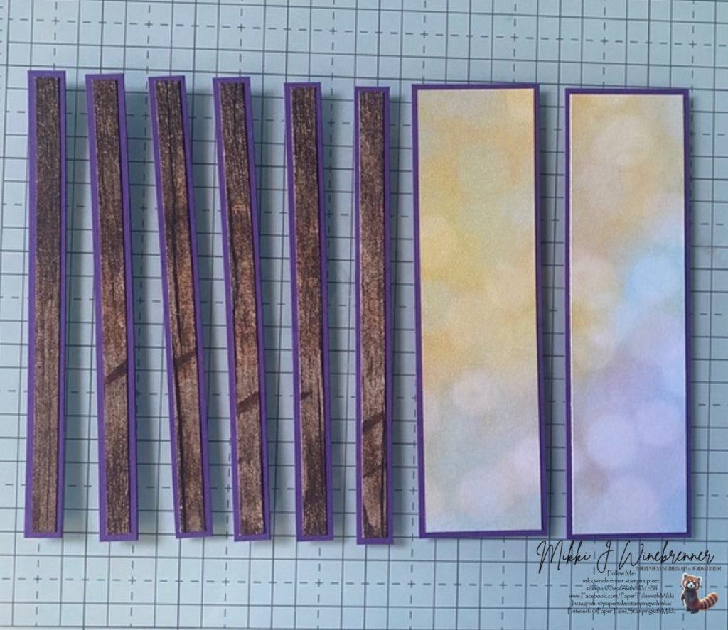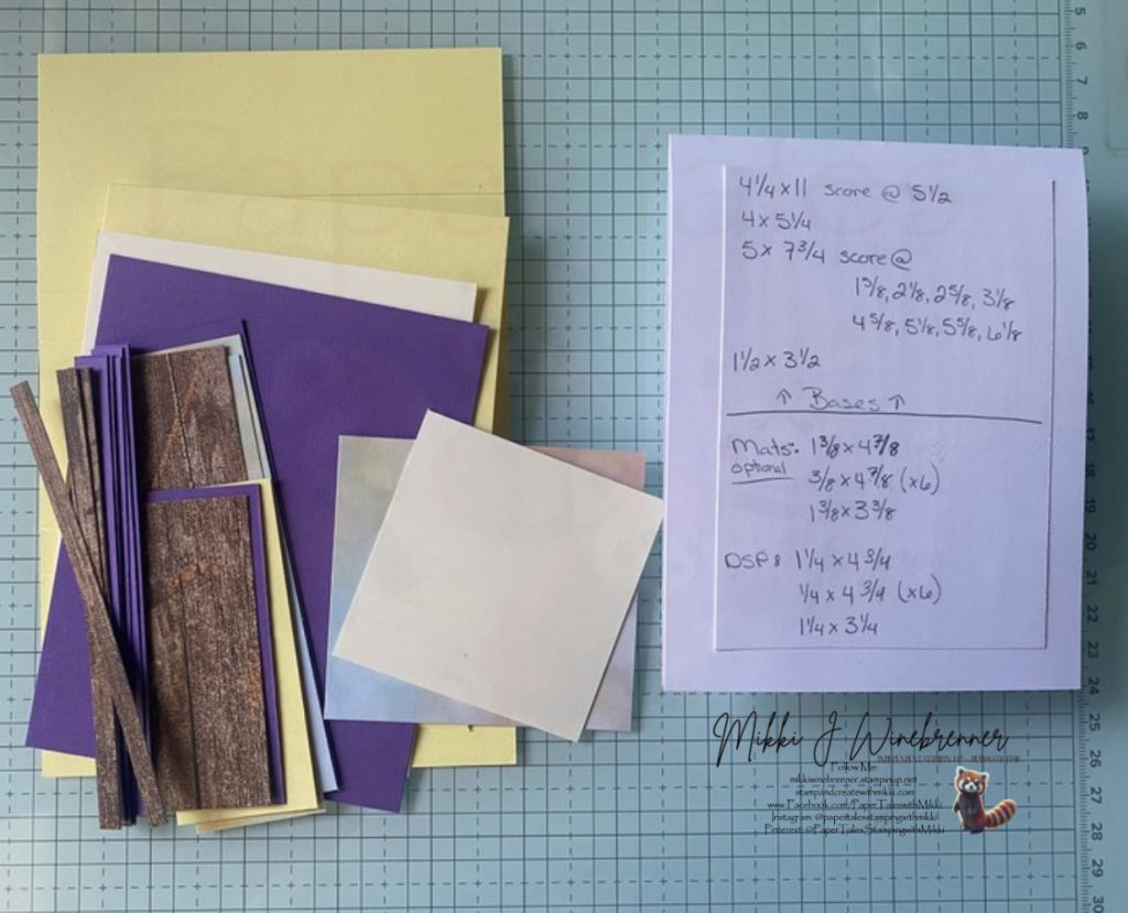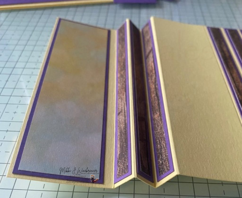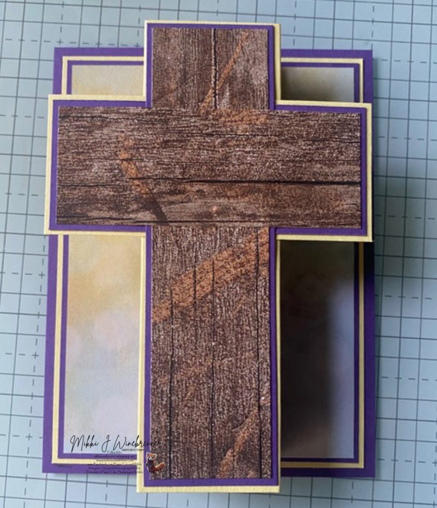 - Attach the 2 small Gorgeous Grape panels over the Lemon Lolly and the Country Woods DSP over that. With this section you really have to build it in layers to get a smooth cross.