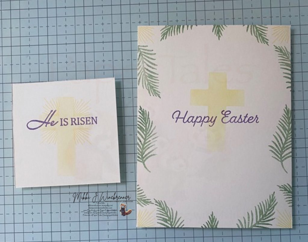 - Stamp the sentiment “He Is Risen” to the center of the small Very Vanilla piece with Gorgeous Grape stamp pad.