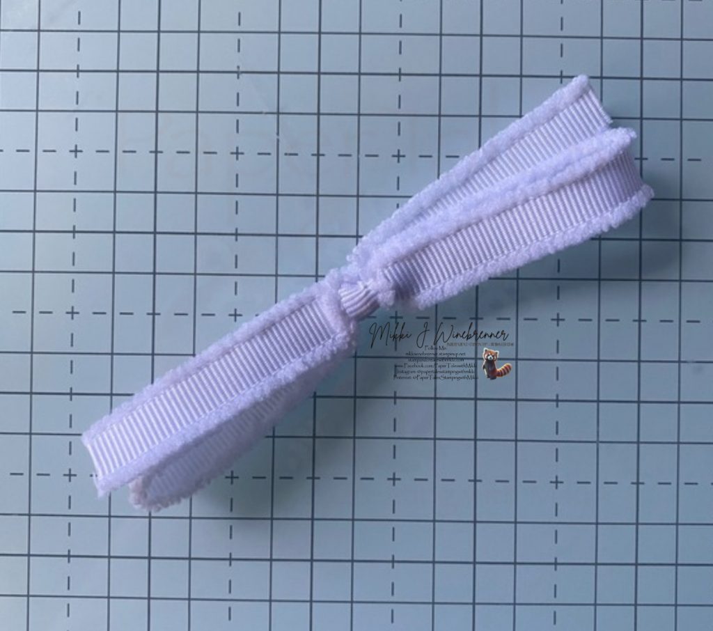 - Tie a large bow (approximately 3-1/2” long) with White Frayed ribbon. Attach that to the back of the sentiment piece with a glue dot and attach to the center of the cross with dimensionals double stacked.