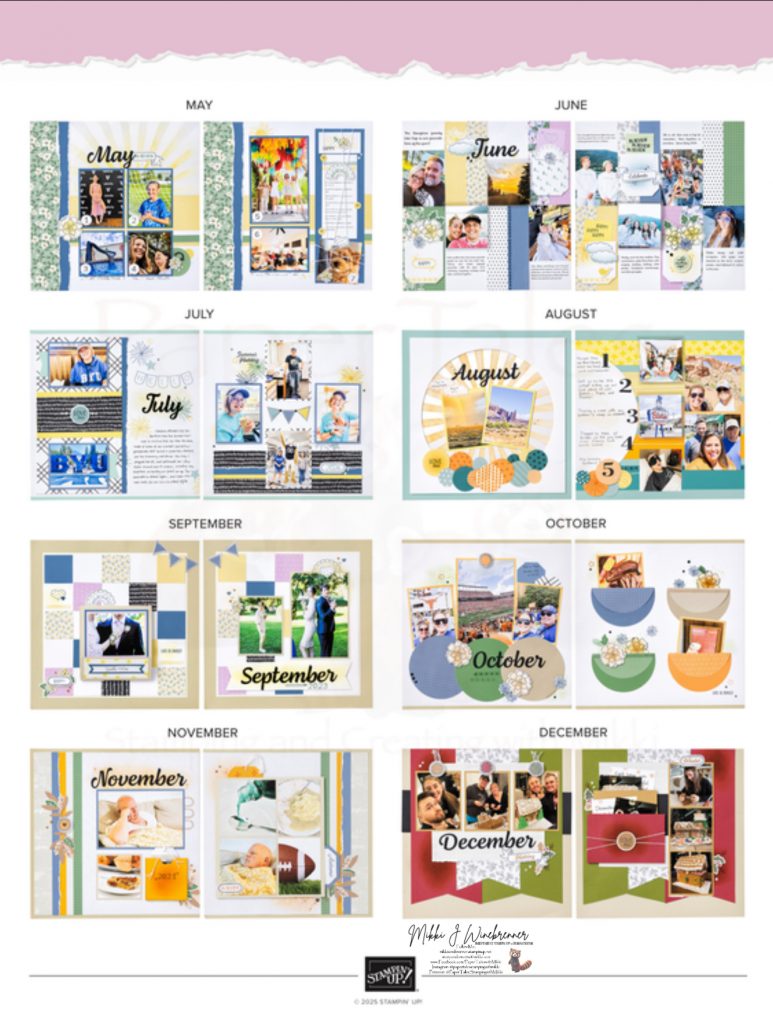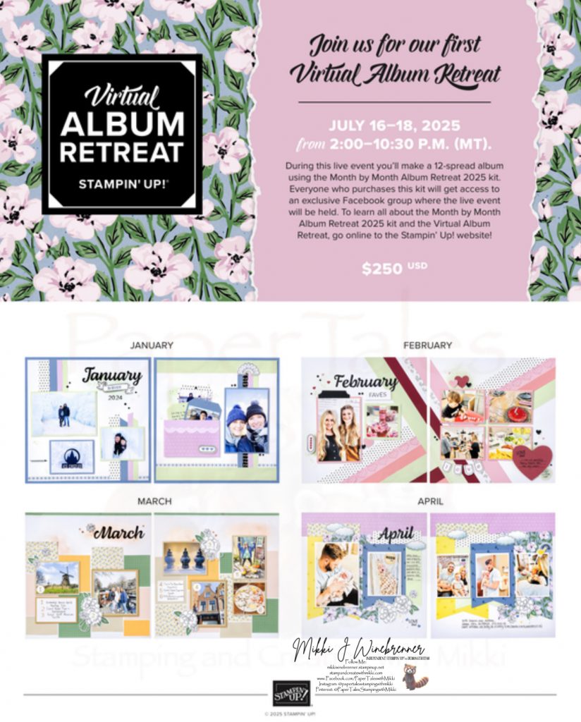 To make the 12-spread album for the Stampin’ Up! Virtual Album Retreat, you’ll want to purchase the Month by Month Album Retreat 2025 kit. Everyone who purchases a kit will receive an email in early July with a link to the exclusive Facebook page where the live event will stream.