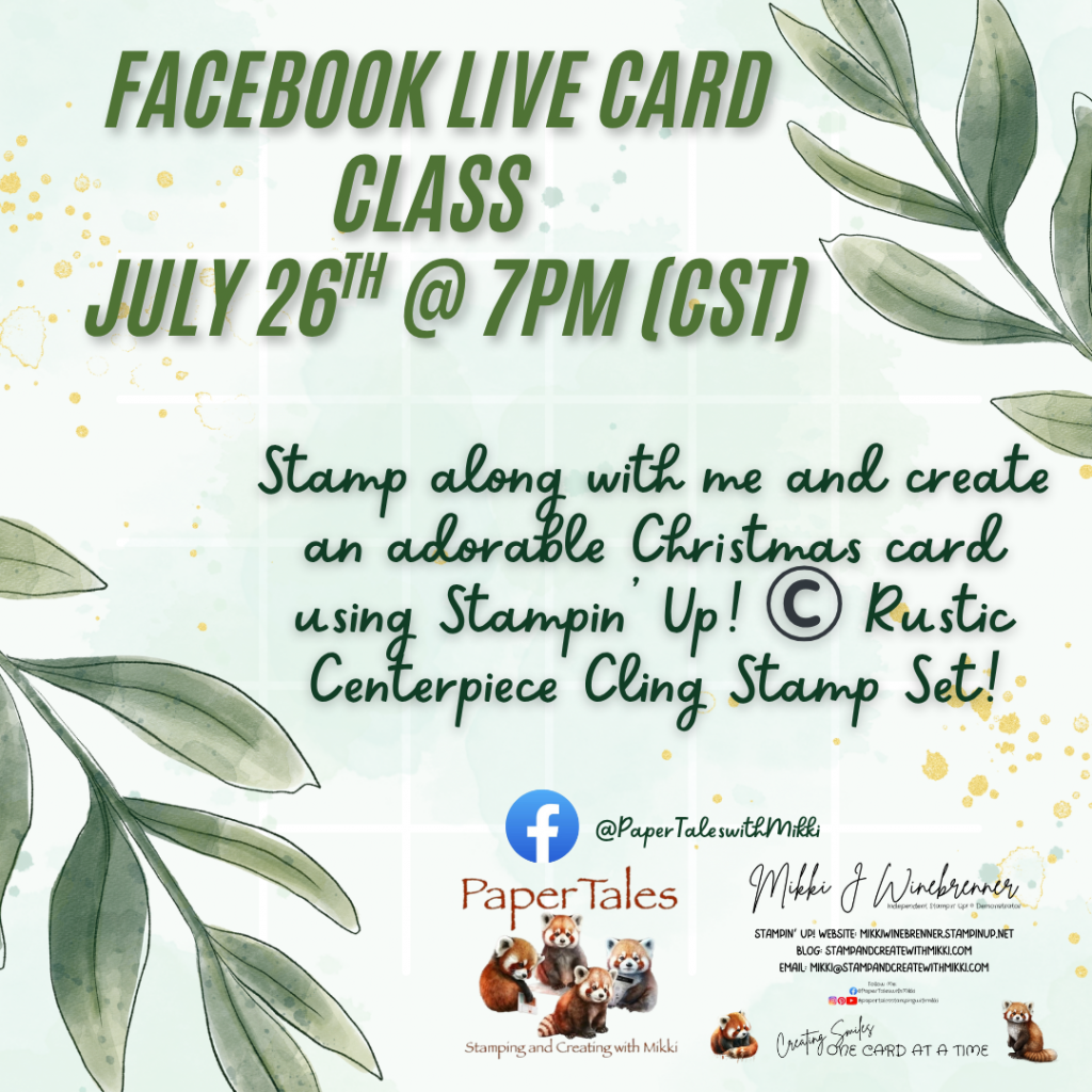 Our next class is Christmas Themed and will be using Stampin’ Up! Rustic Centerpiece. See you Saturday July 26th @ 7PM (CST)!