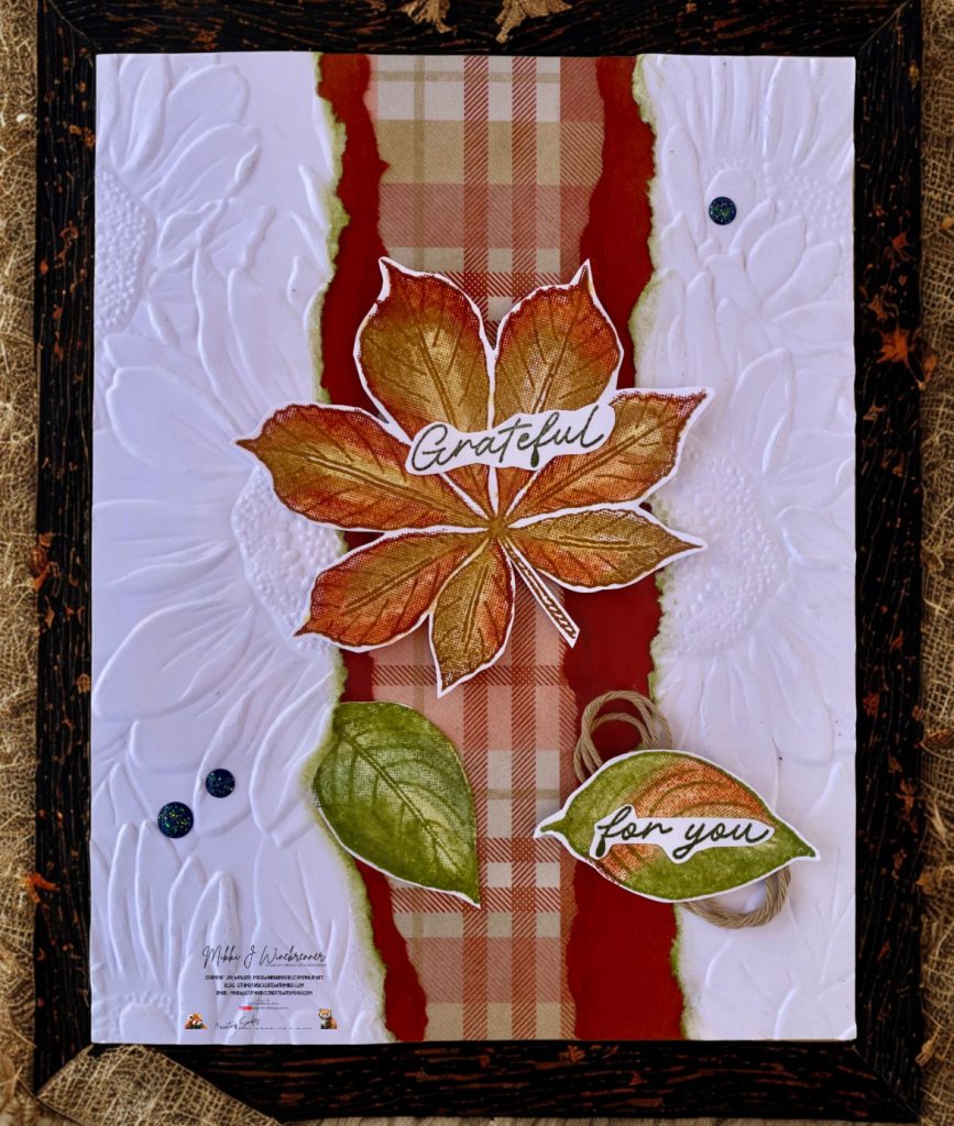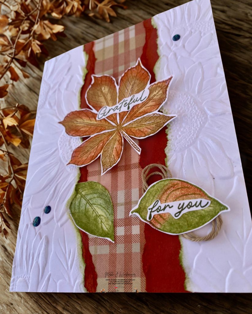 - The sentiment is stamped in Mossy Meadow. Fussy cut out the sentiment and the leaf. Attach the word “Grateful” to the large leaf. Attach “for you” to a small leaf. Attach the large leaf to the center of the card with dimensionals. Attach the small leaf with the sentiment to the lower right corner also with dimensionals and a little bit of Linen Thread behind it. Attach the remaining leaf to the card front with liquid glue.