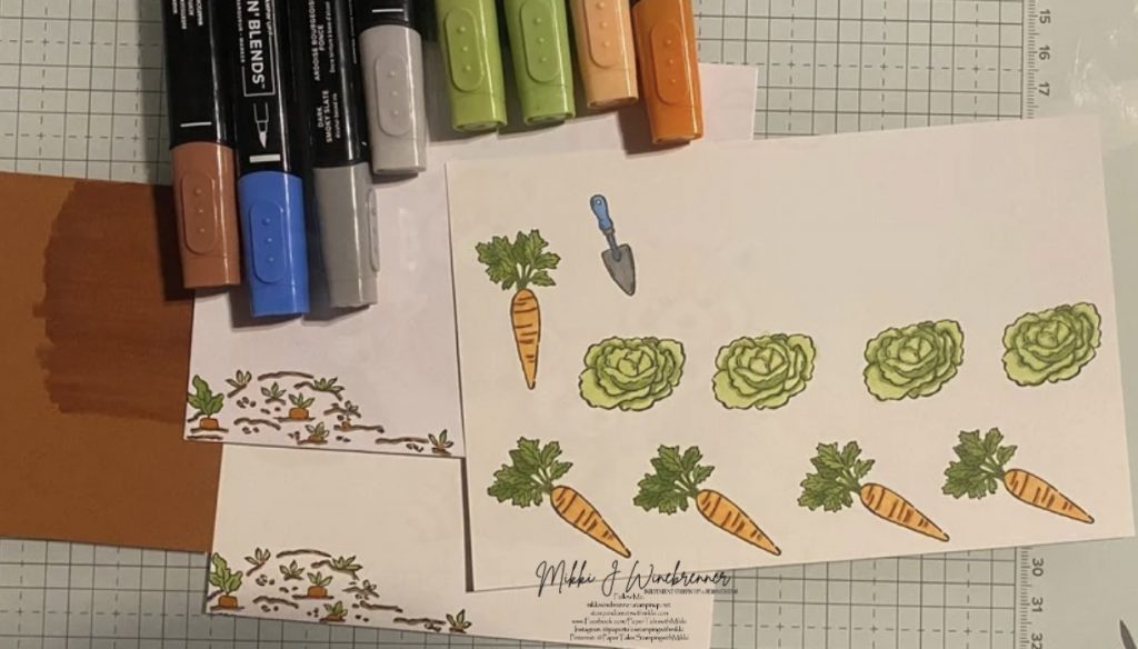 Stamp several heads of lettuce and carrots on a scrap piece of Basic White, one shovel as well. Also stamp carrot mounds on the one of the 4” Basic White Pieces and one on the envelope. Use Memento Tuxedo Black as we will be using Alcohol Markers for the coloring. **For anyone new to Alcohol Markers, always use water based ink, alcohol and alcohol don’t mix well.