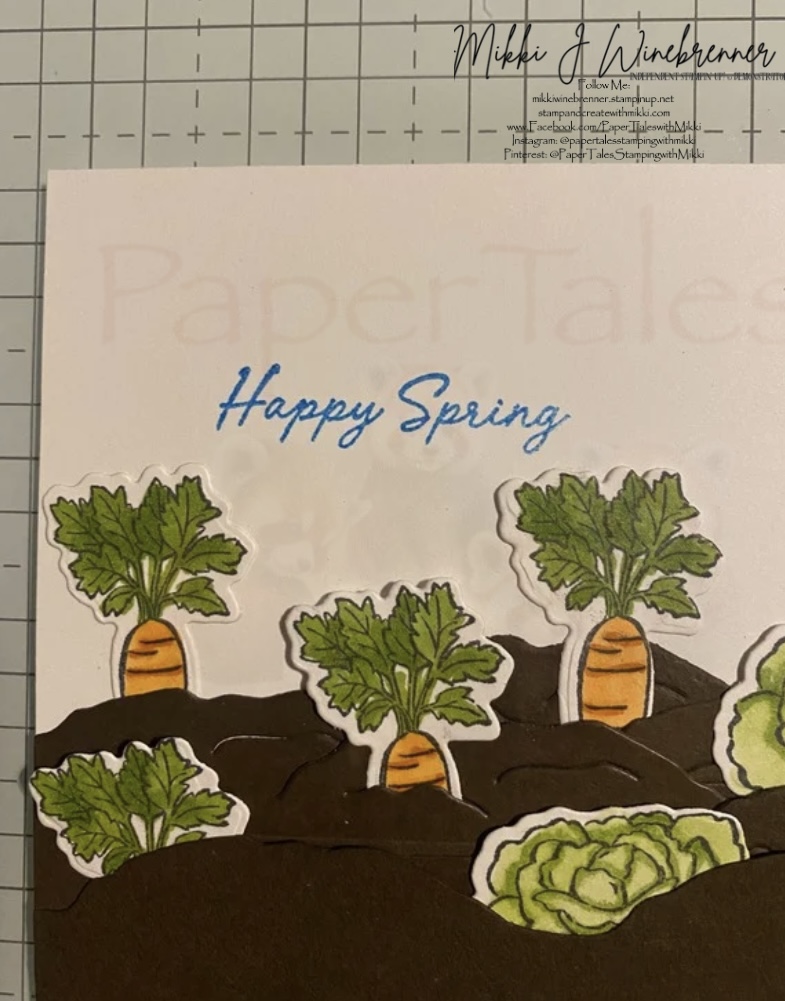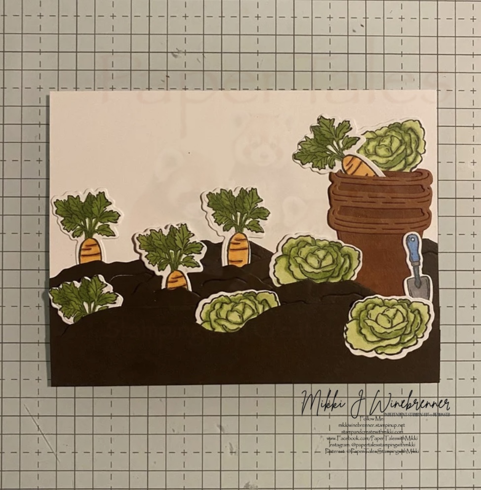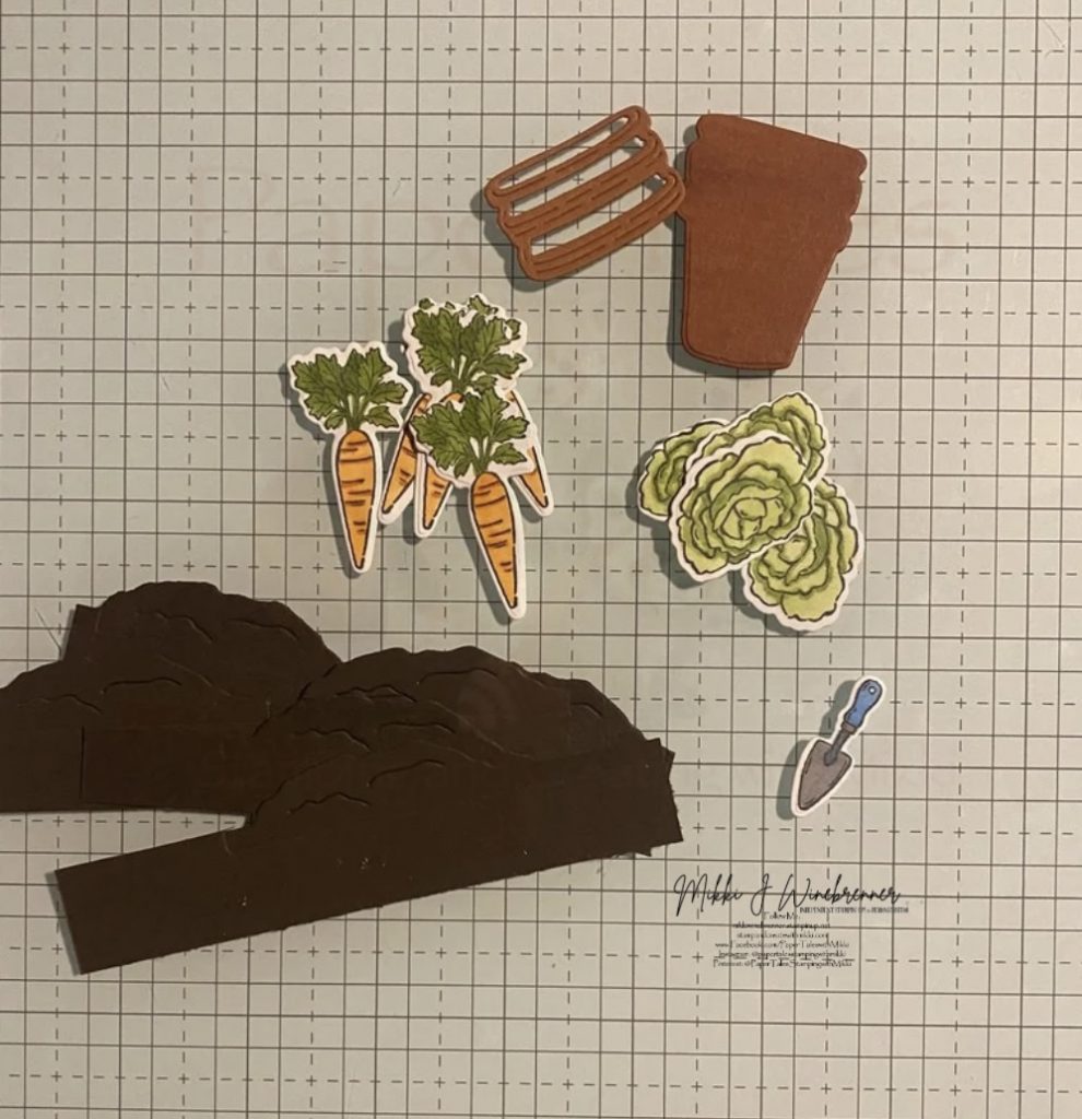 Cut out all the veggies, shovel, pots, pot lips and dirt with the coordinating dies. Remember the dirt dies are borders so the the bottom portions wont cut off. We will trim them down as we go.