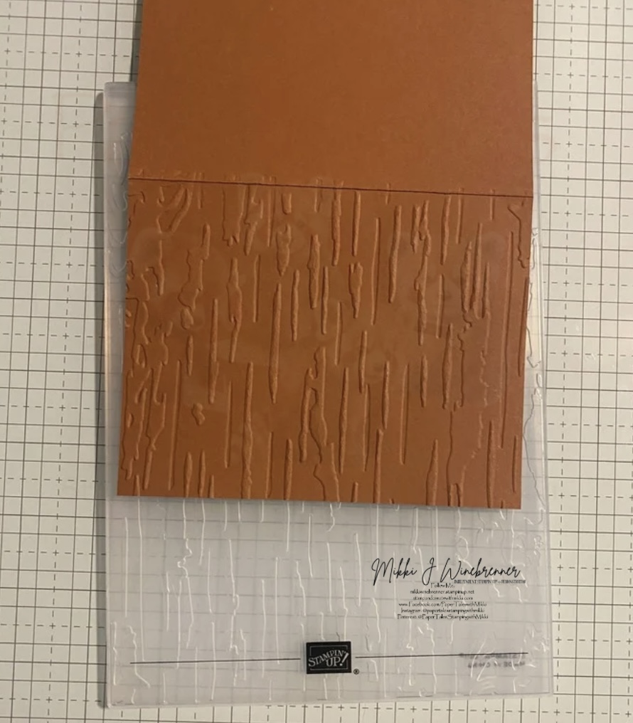 Run the front of the card base through the Stampin’ Cut and Emboss Machine with the Birch Wood 3D Embossing Folder.