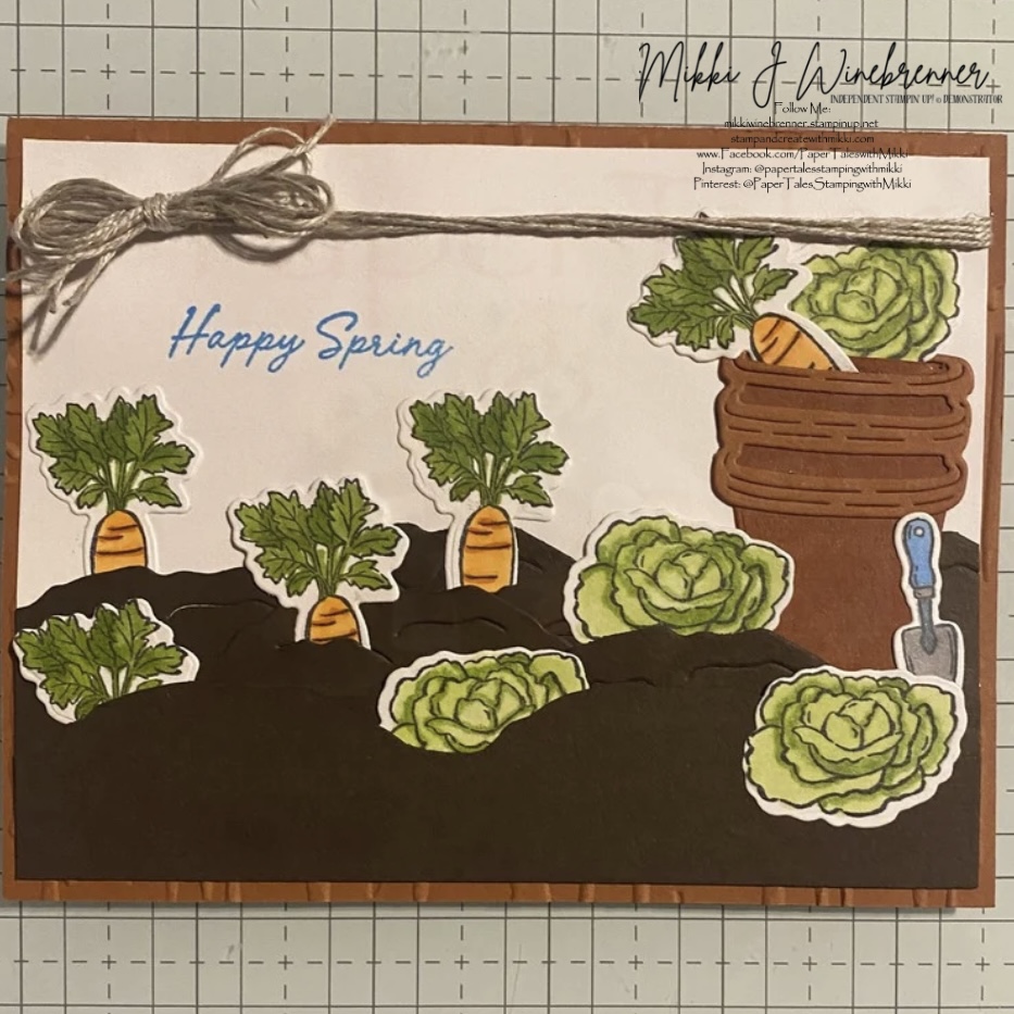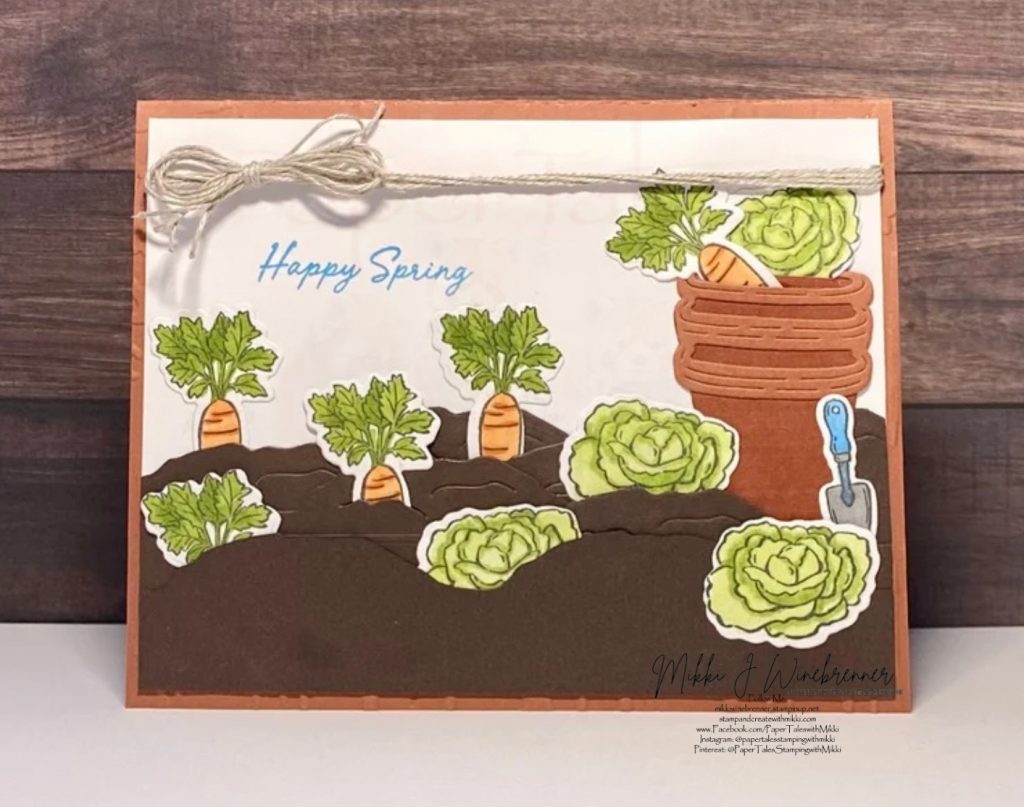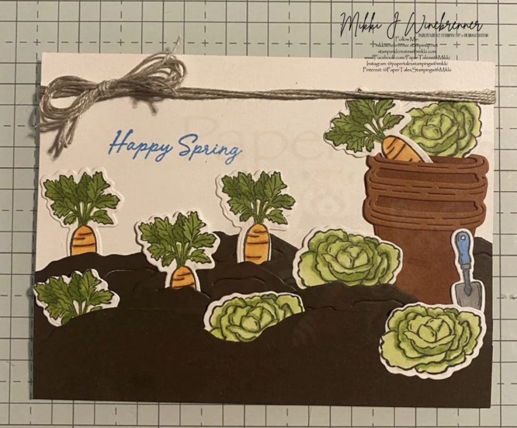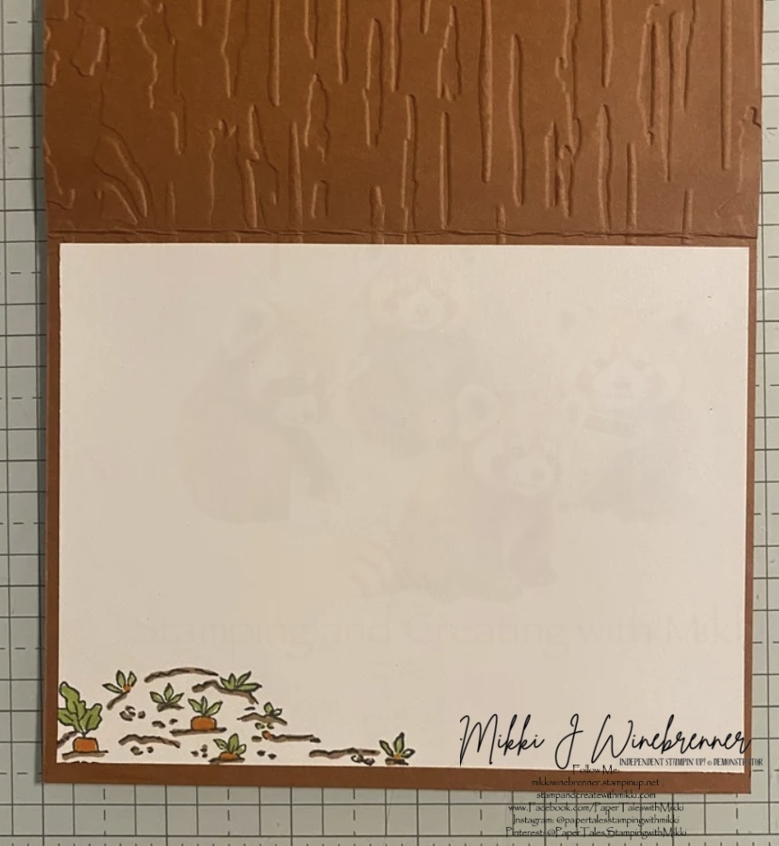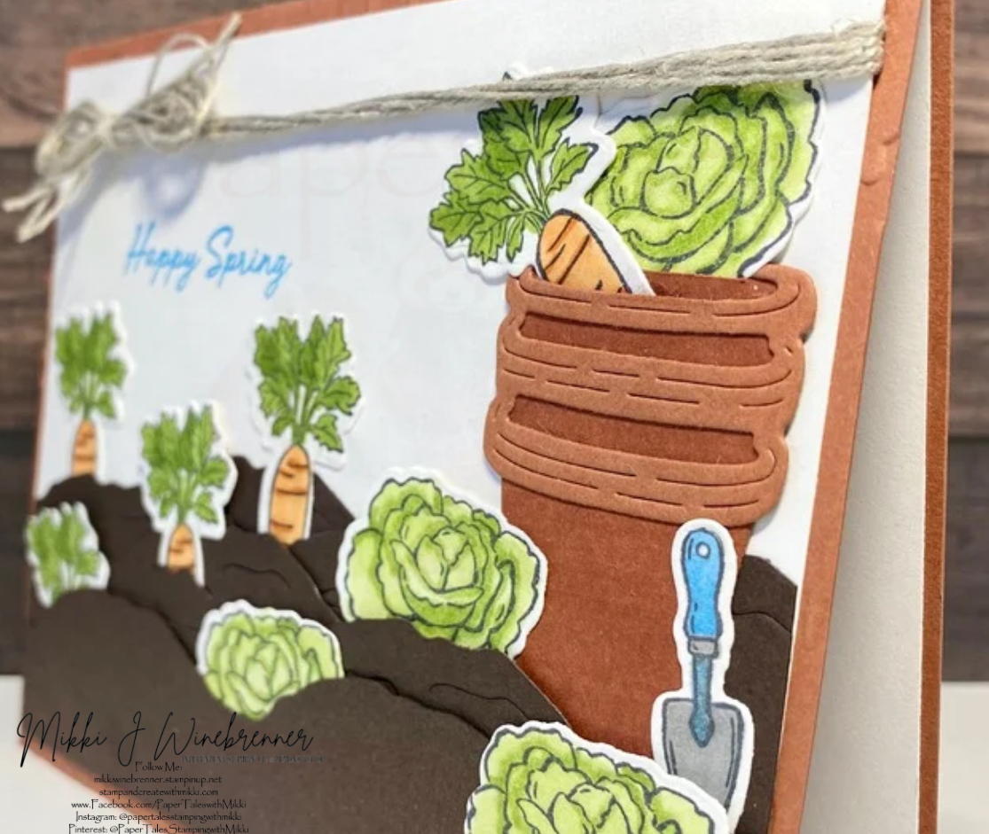 Color in the veggies and shovel with Granny Apple Green, Pumpkin Pie, Gray Granite, Old Olive and Azure Afternoon Stampin Blends. Don’t forget to color the inside piece and envelope!